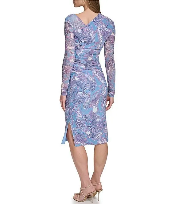 Paisley Print Long Sleeve Asymmetrical V-Neck Mesh Midi Bodycon Dress