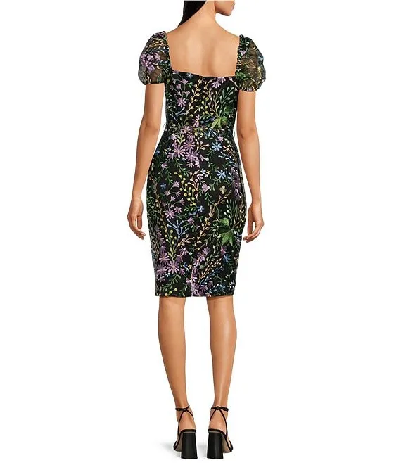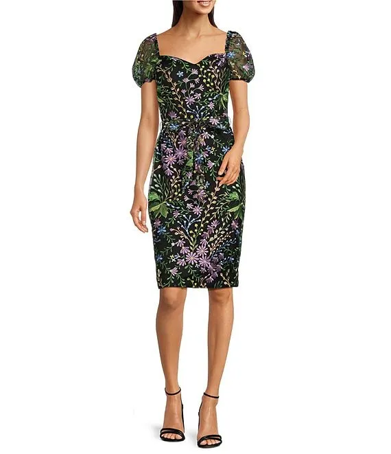 Floral Embroidered Mesh Sweetheart Neck Short Puff Sleeve Sheath Dress