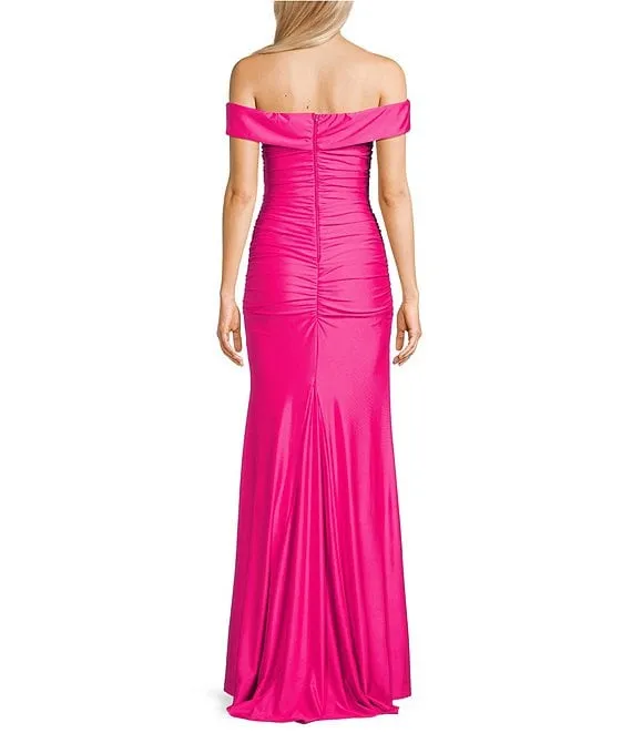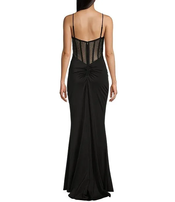Scoop Neck Shirred Illusion Mesh Rhinestone Back Long Dress