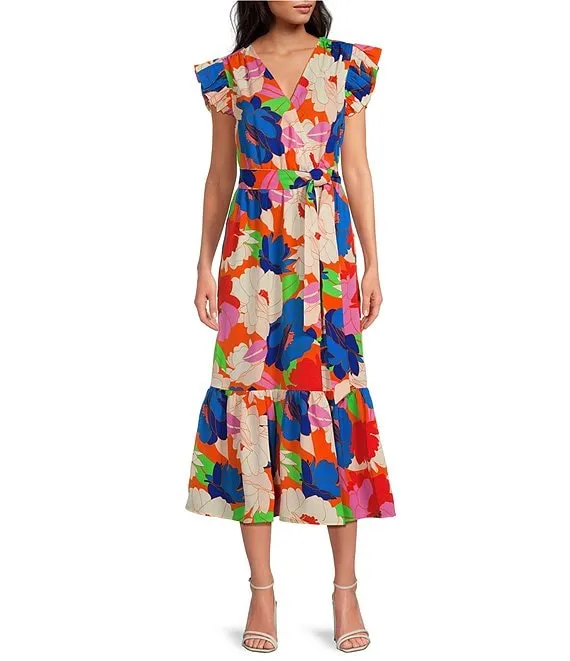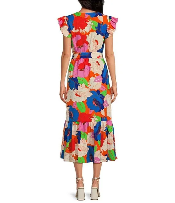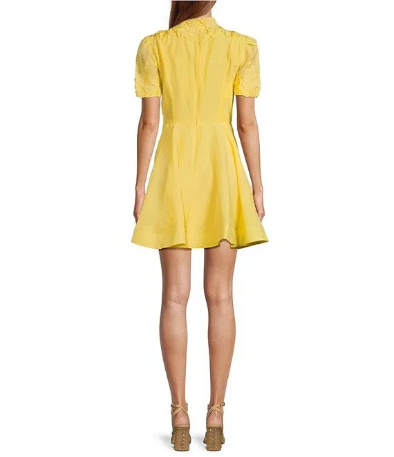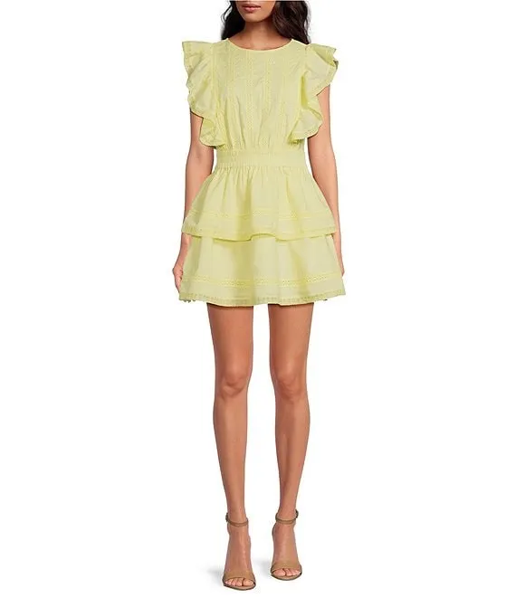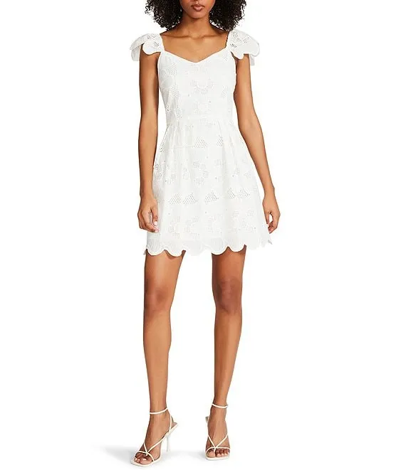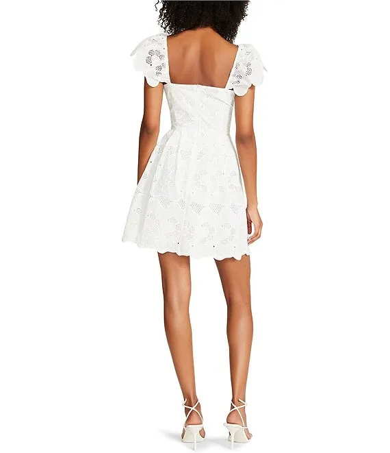Sierra Embroidered Floral V-Neck Short Flutter Sleeve Scalloped Dress