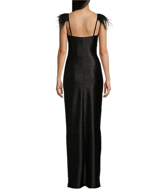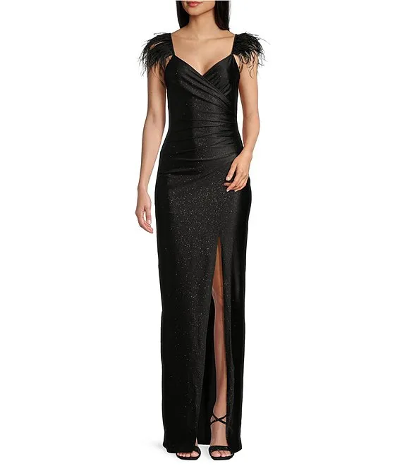 Feather Shoulder Trim Faux Wrap Front Slit Long Dress