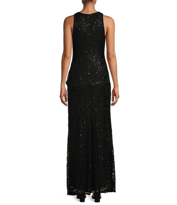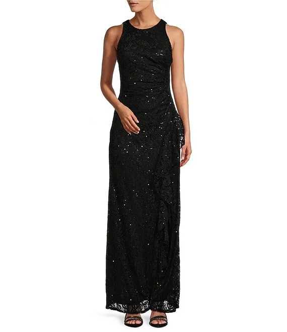 Crew Neck Sleeveless Cascade Ruffle Thigh High Slit Sequin Lace Stretch Gown