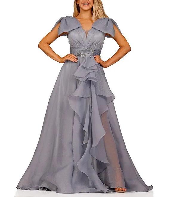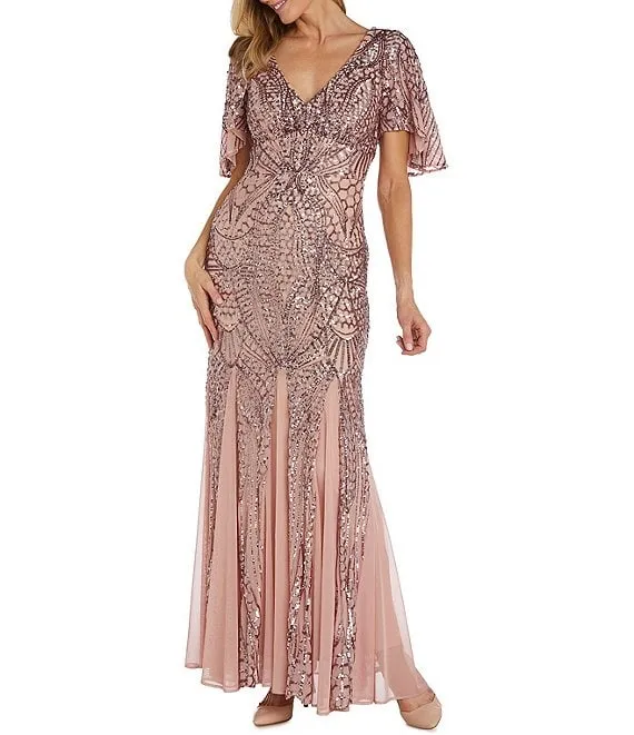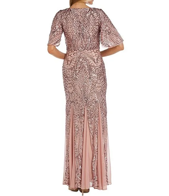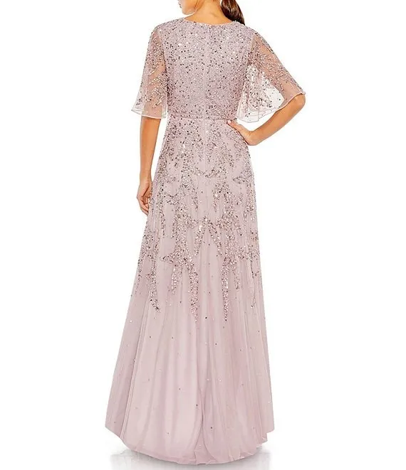 Mac Duggal Beaded Short Flutter Sleeve Surplice V-Neck High-Low Faux Wrap Gown