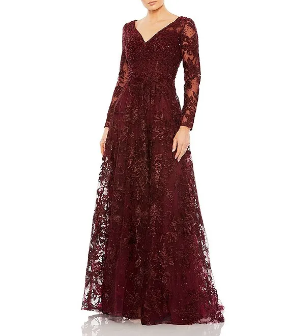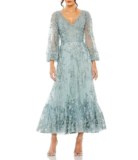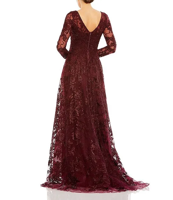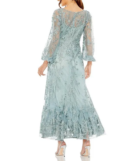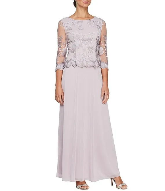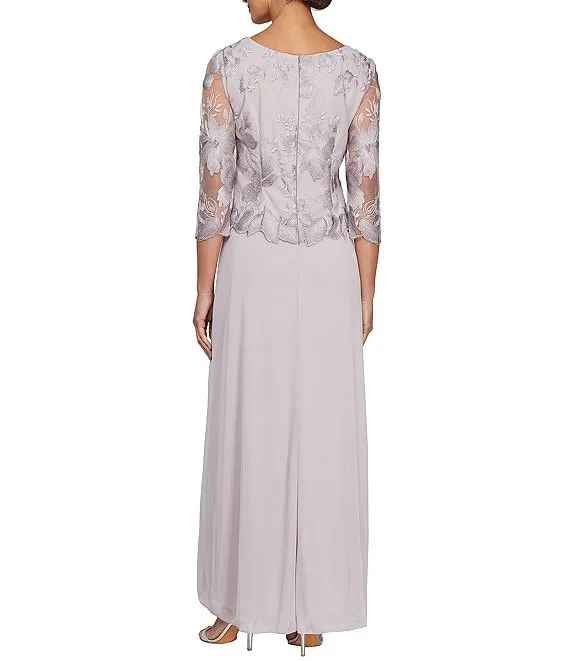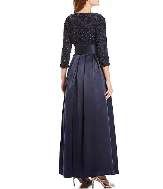 3/4 Illusion Sleeve Boat Neck Floral Embroidered Lace Long A-Line Dress