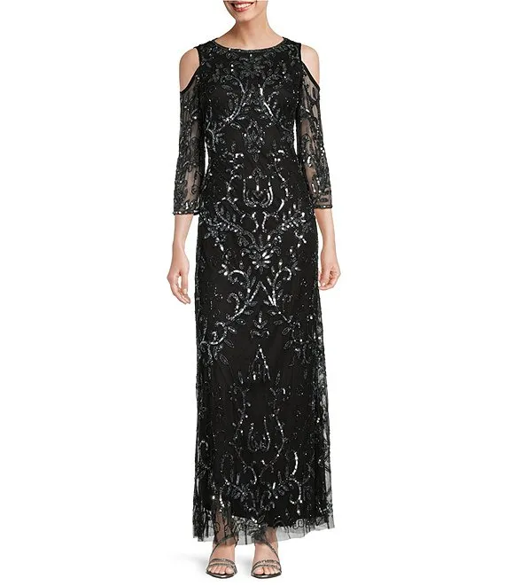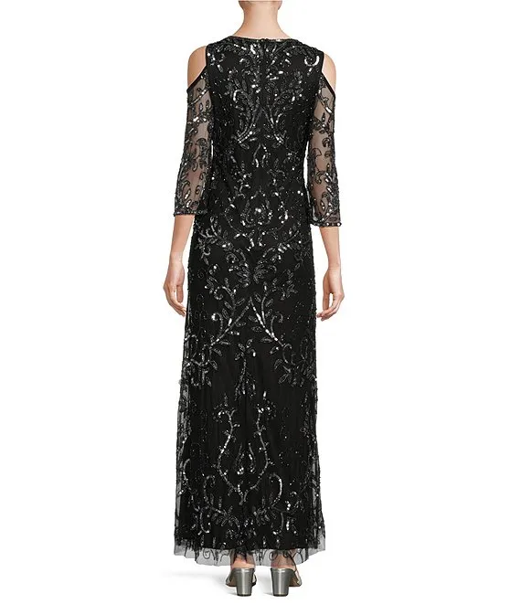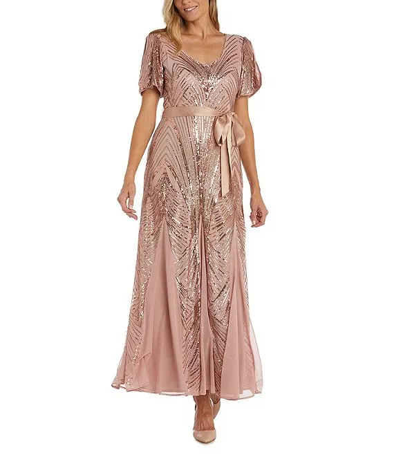 Short Puffed Sleeve Scoop Neck Sequin Long Dress