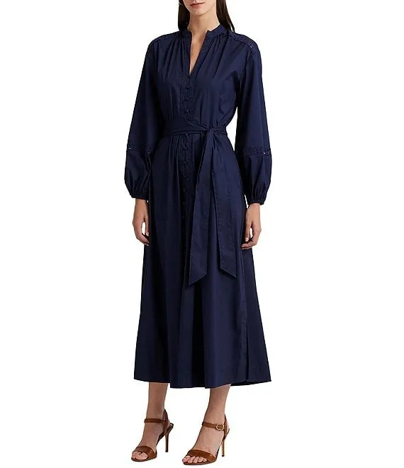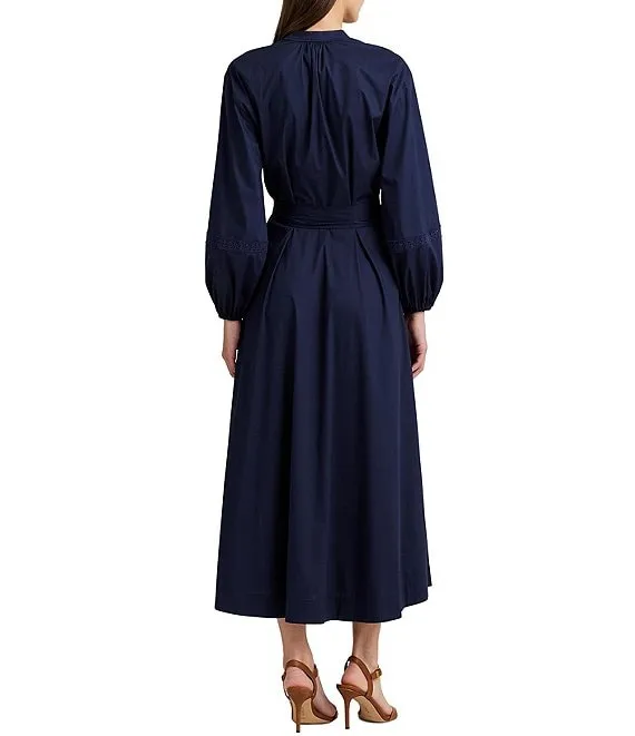 Lauren Ralph Lauren Lace Trim Belted Long Blouson Sleeve A-Line Midi Dress