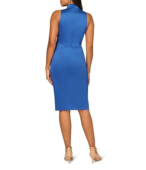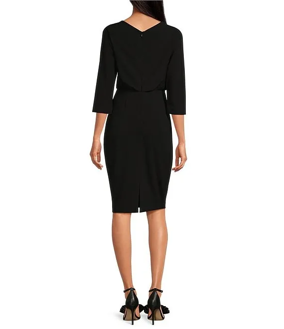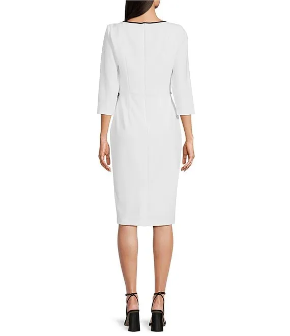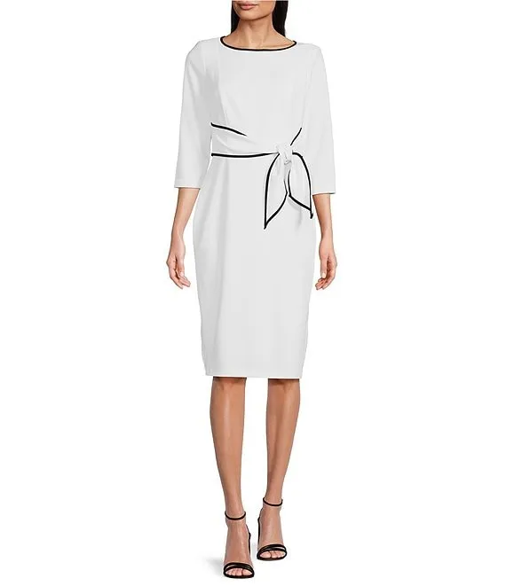 Adrianna Papell Contrasting Trim Boat Neck 3/4 Sleeve Tie Waist Crepe Sheath Dress