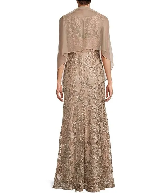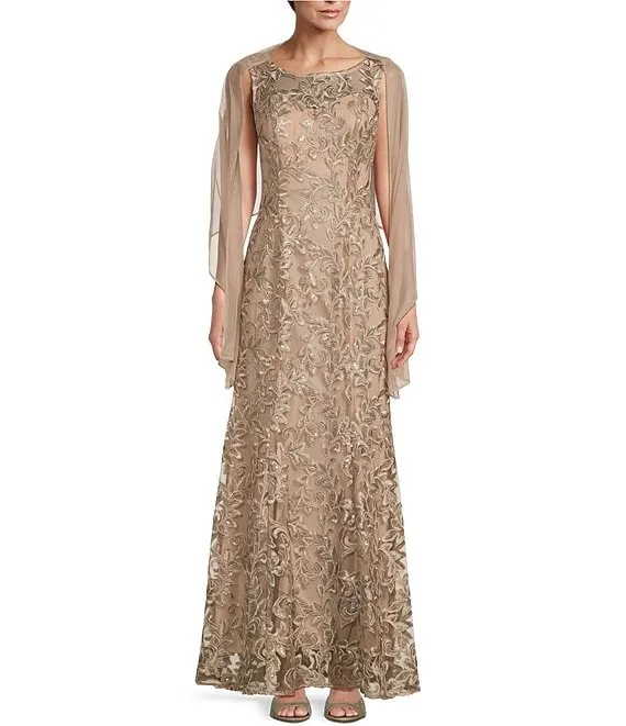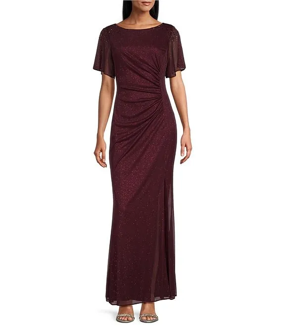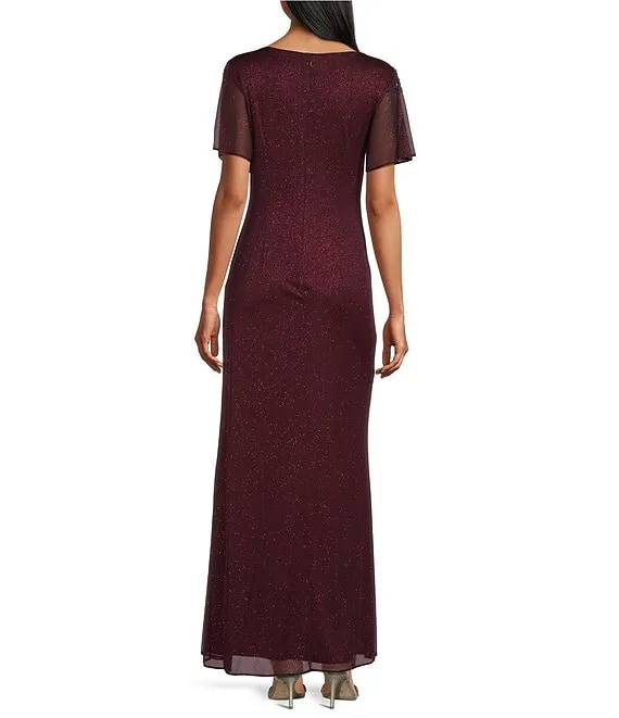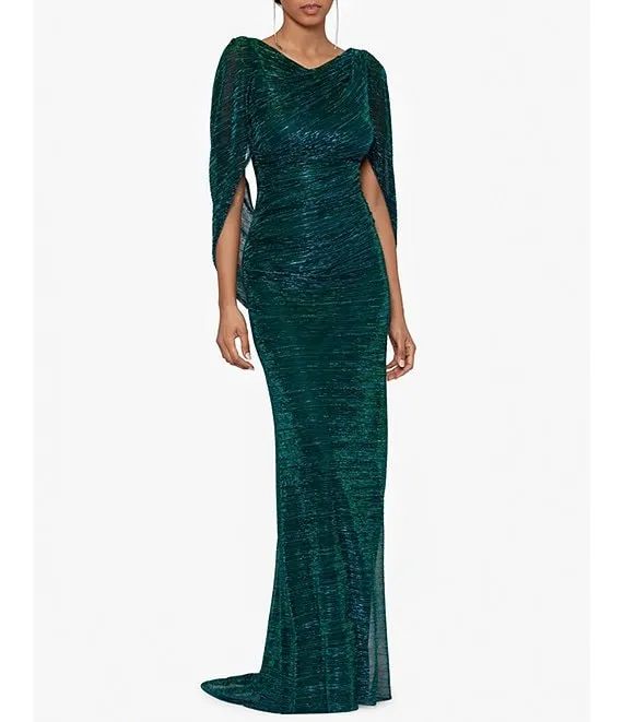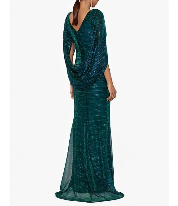 Drape Back Detail 3/4 Cape Sleeve Draped Round Neck Metallic Crinkle Ruched Sheath Gown