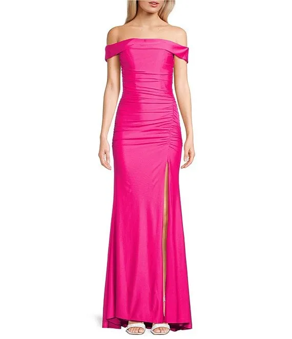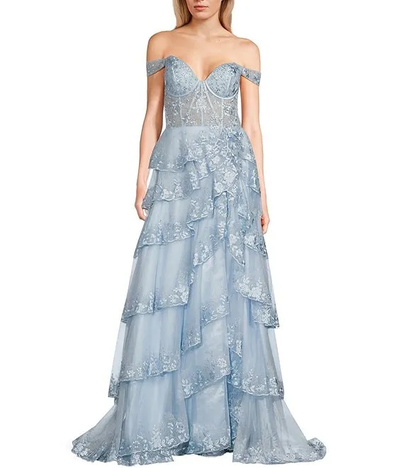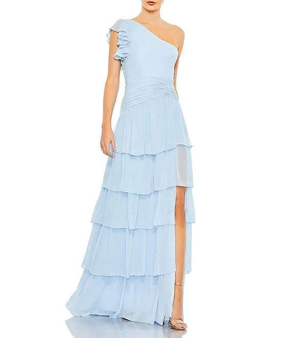 Mac Duggal Ruffle One Shoulder Ruched Waist Sleeveless Tiered Gown