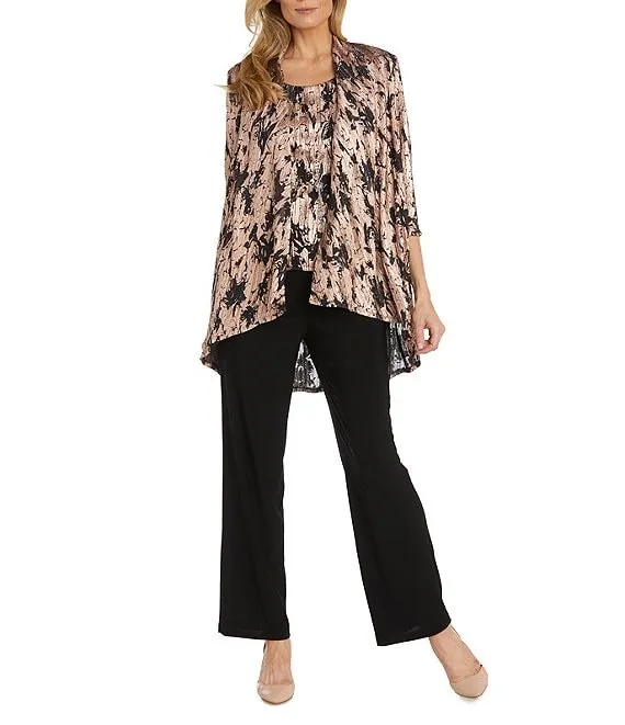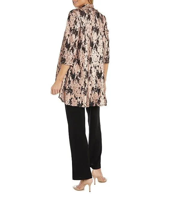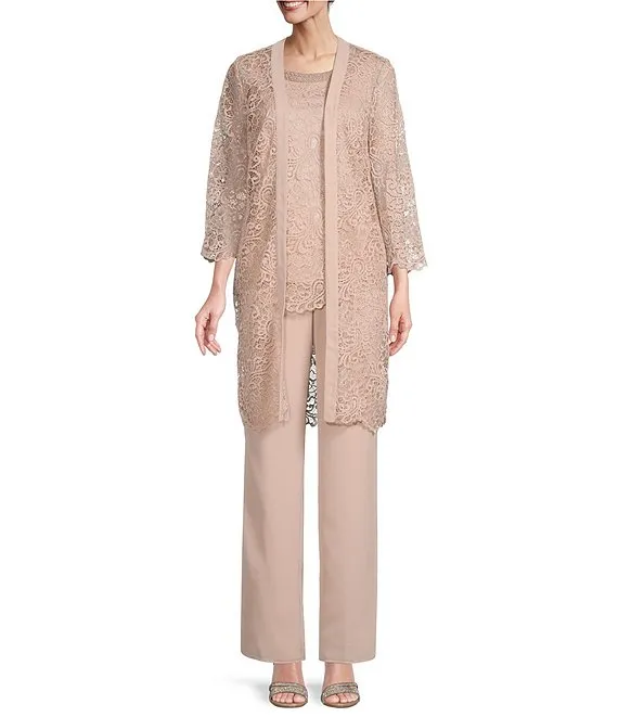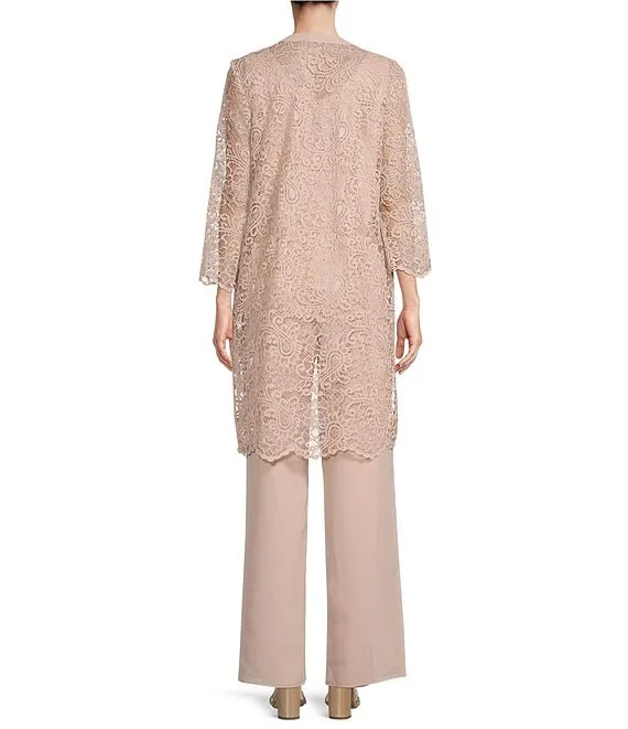 Lace 3/4 Sleeve Beaded Round Neck 3-Piece Duster Knit Pant Set