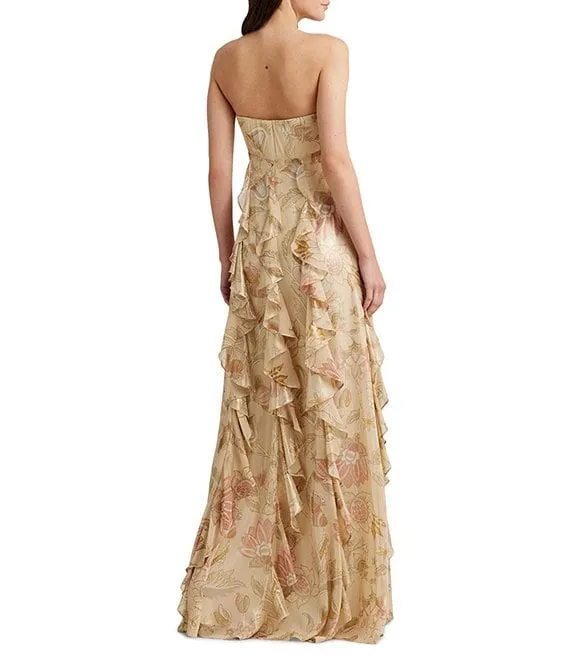 Lauren Ralph Lauren Floral Metallic Chiffon Sweetheart Neck Strapless Ruffled Gown
