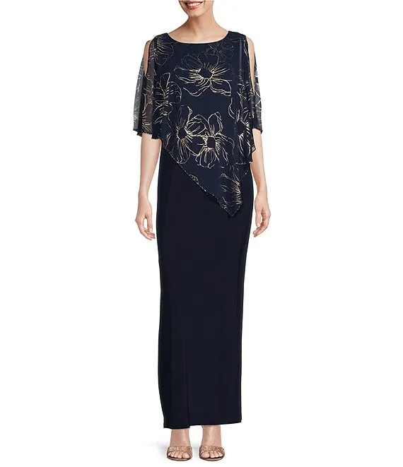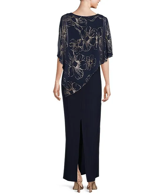 Short Caplet Sleeve Round Neck Asymmetric Floral Overlay Long Dress