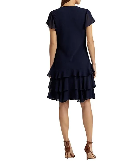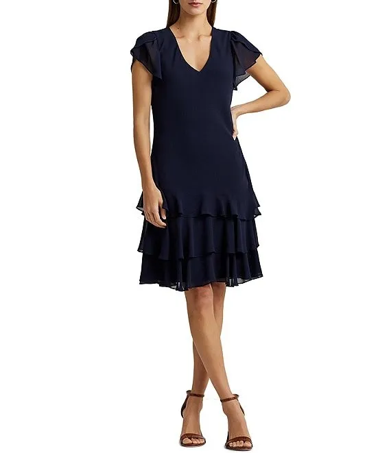 Lauren Ralph Lauren Georgette V-Neck Short Flutter Sleeve Drop Waist Dress
