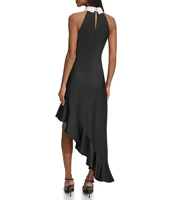 Round Neck Sleeveless Ruffle High-Low Stretch Crepe Gown
