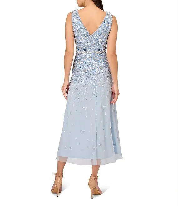 Adrianna Papell Illusion Beaded V-Neck Sleeveless A-Line Midi Dress