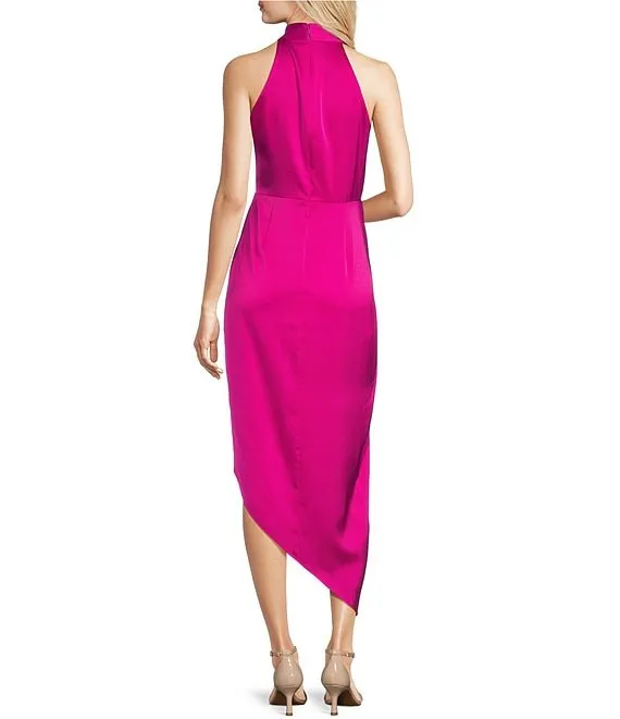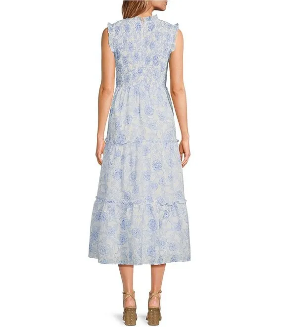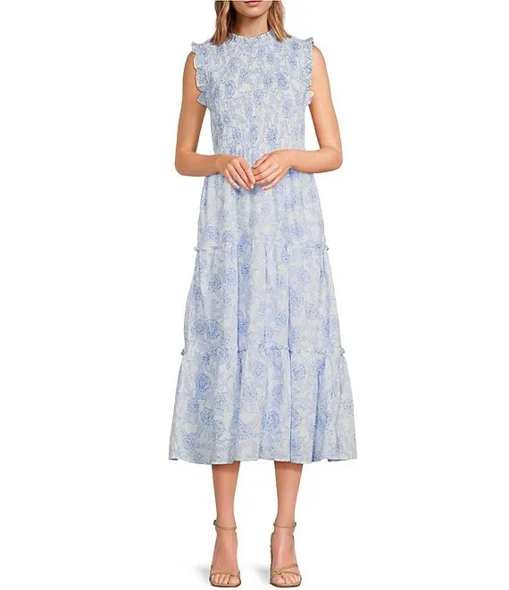 Palmer Sleeveless Ruffle Mock Neck Ruched Tiered Pocketed Midi Dress