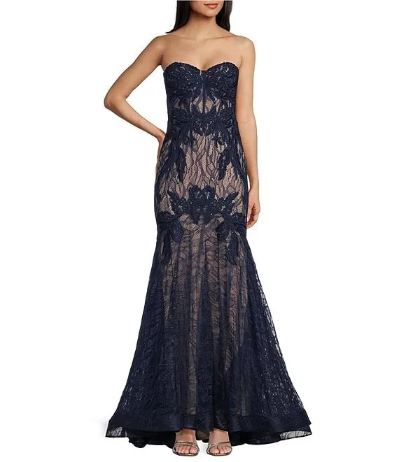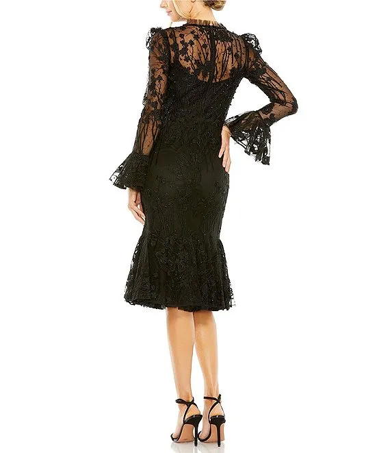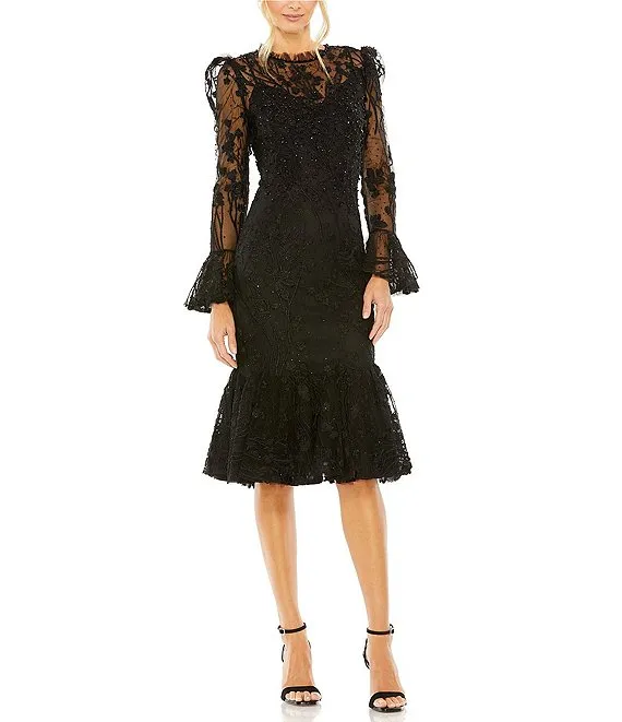 Mac Duggal Lace Illusion Crew Neck Long Sleeve Midi Mermaid Dress