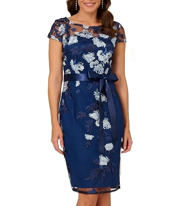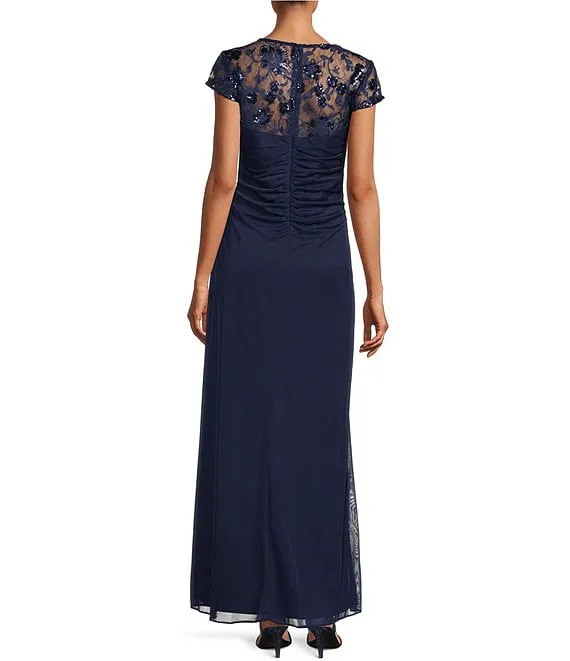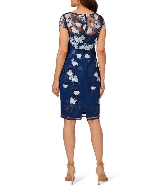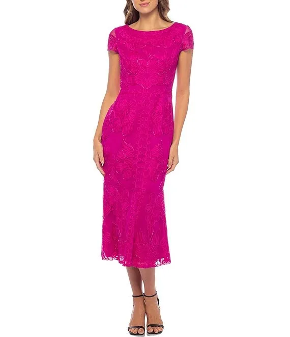 Cap Sleeve Crew Neck V-Back Beaded Mesh Sheath Dress