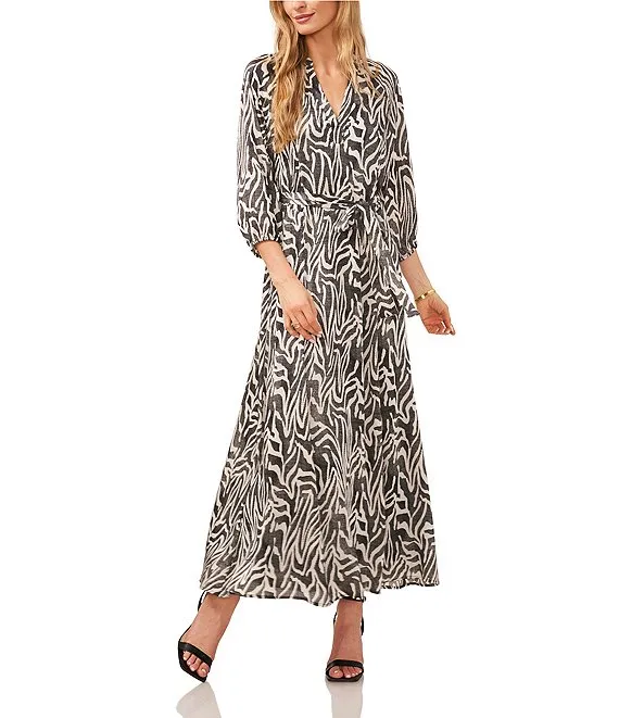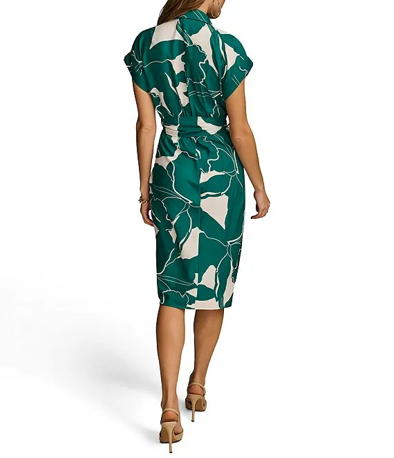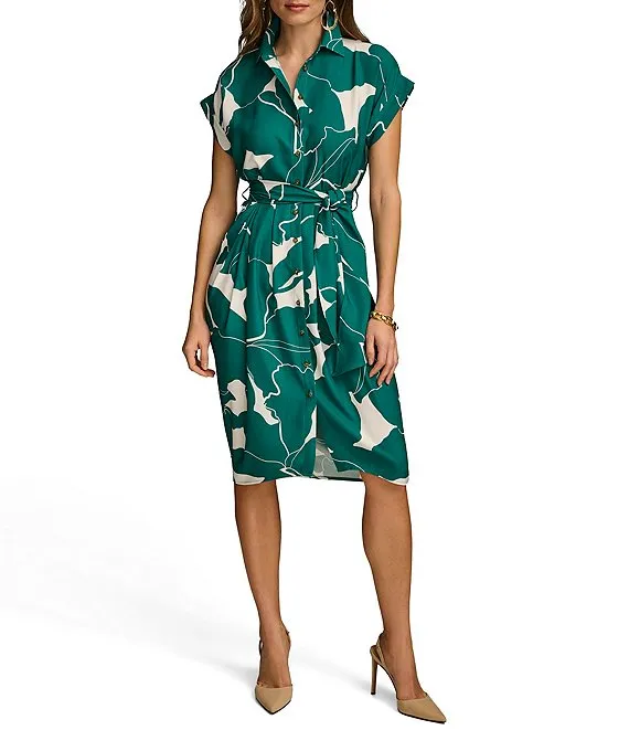 Short Sleeve Point Collar Tie Waist Printed Button Down Knee Length Dress