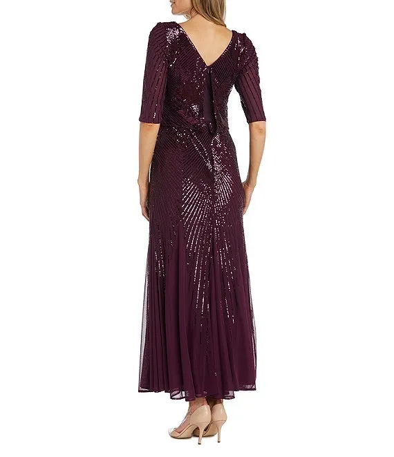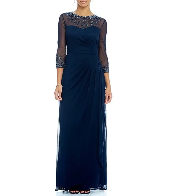 Long Beaded Illusion Sweetheart Neck 3/4 Sleeve Ruched Dress