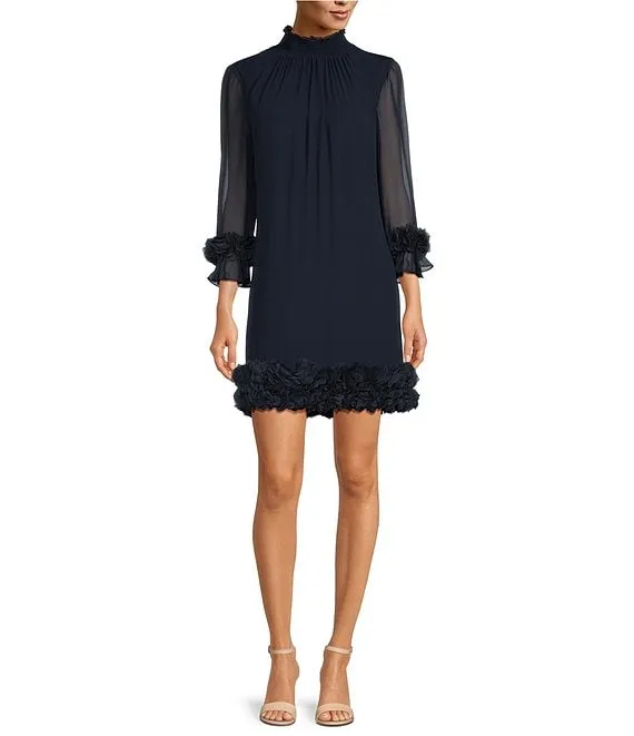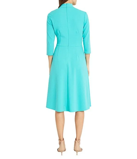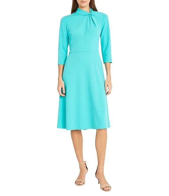 Twisted Mock Neck Stretch Crepe A-Line 3/4 Sleeve Dress