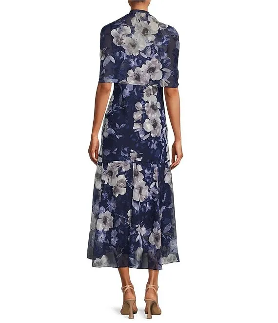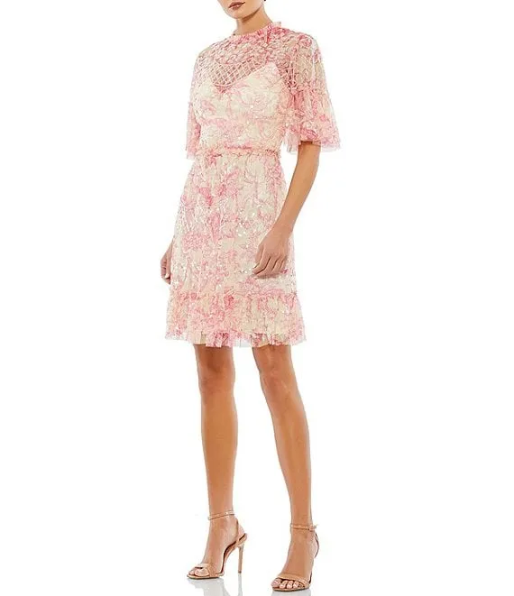 Mac Duggal Floral Print Mock Neck Short Flounce Sleeve Sequin Embellished Tiered Ruffle Hem Dress