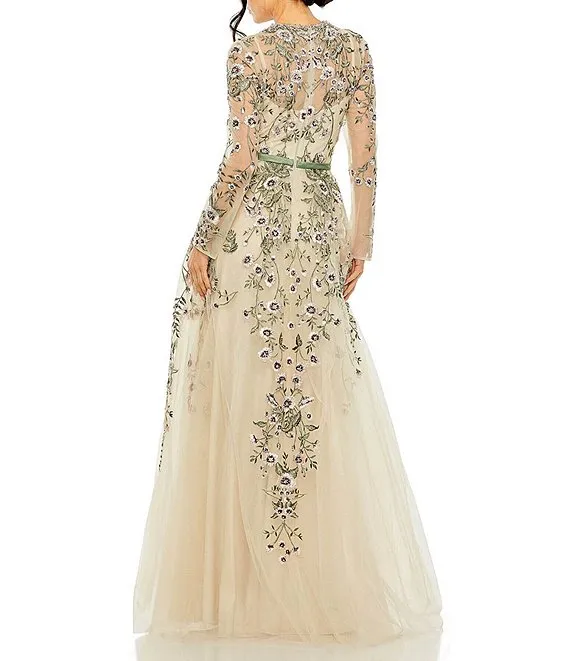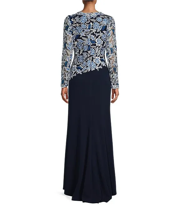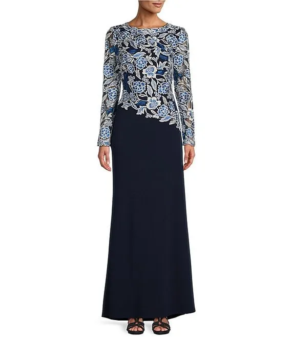 Mac Duggal Floral Embroidery Illusion Crew Neck Long Sleeve Gown