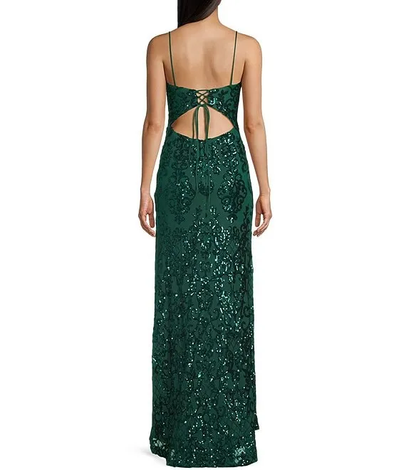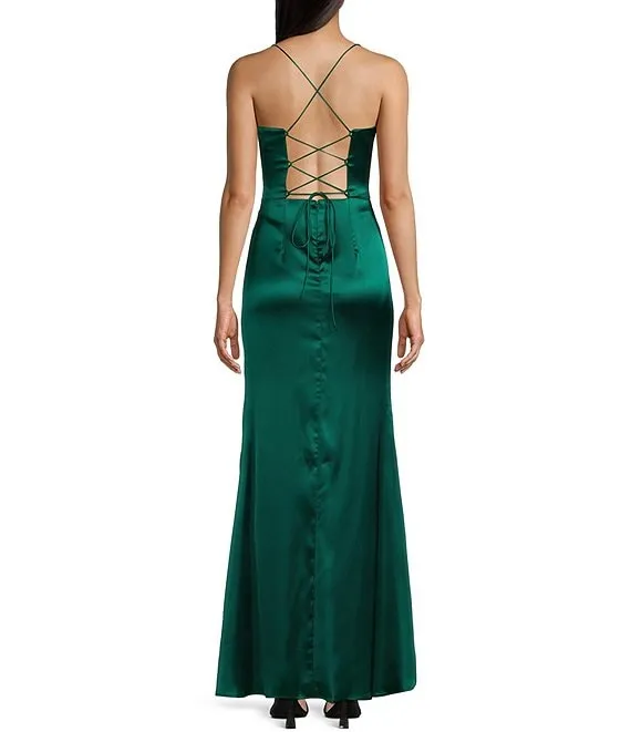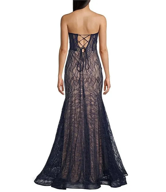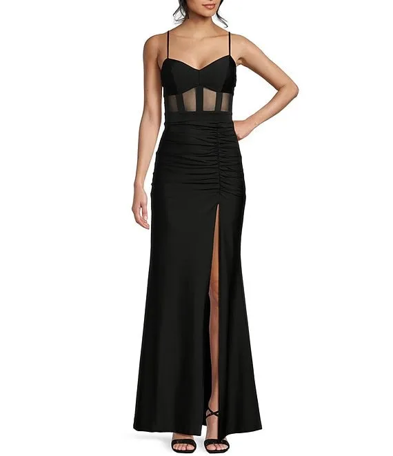 Illusion Corset Shirred Side Slit Long Dress
