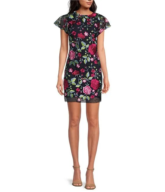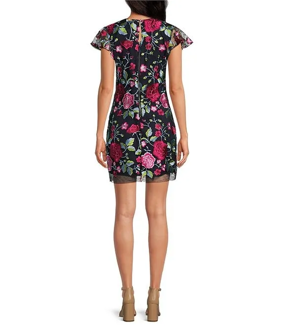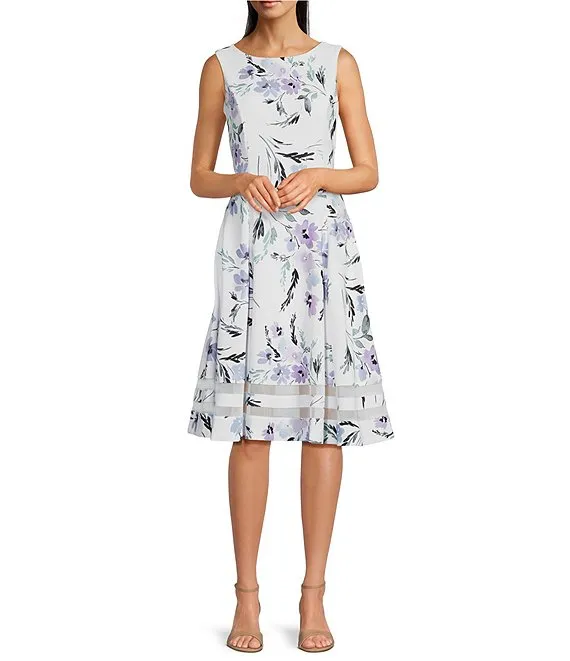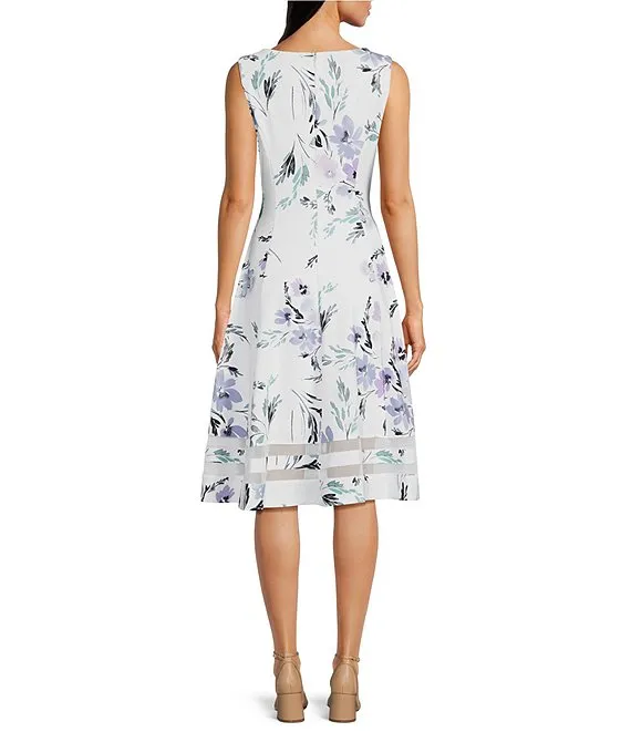 Calvin Klein Scuba Crepe Sleeveless Crew Neck Floral Mesh Lined Cutout A-Line Dress