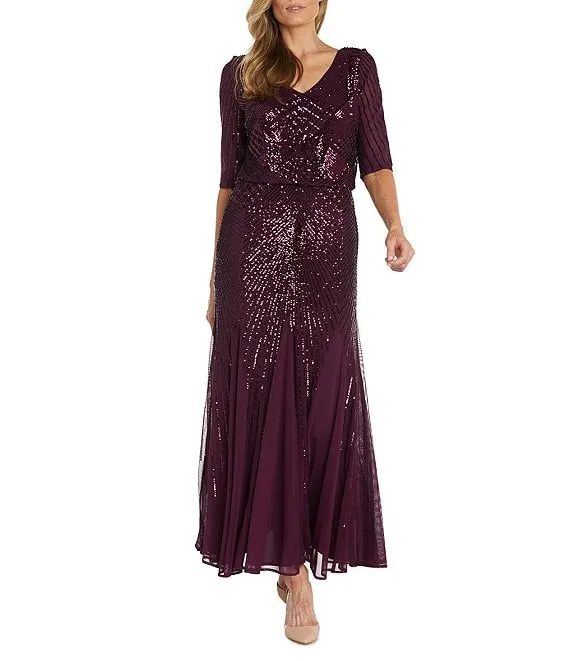 3/4 Sleeve V-Neck Sequin Beaded Blouson Dress