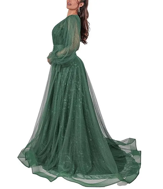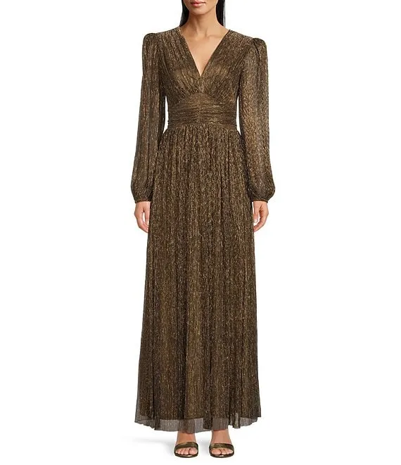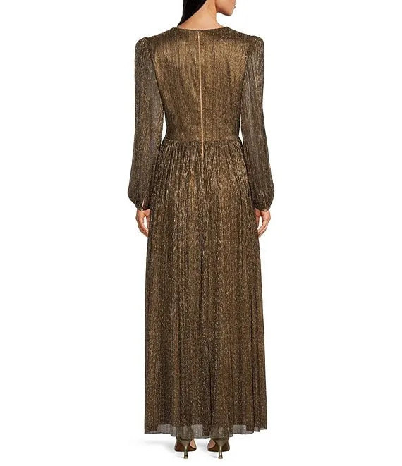 Bella Crinkle Metallic V-Neck Blouson Long Sleeve A-Line Gown