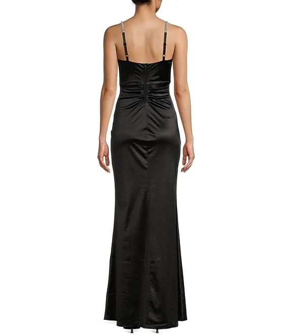 Rhinestone Strap Faux Wrap Shirred Long Dress