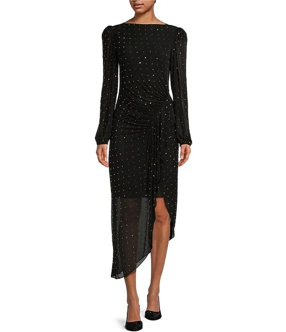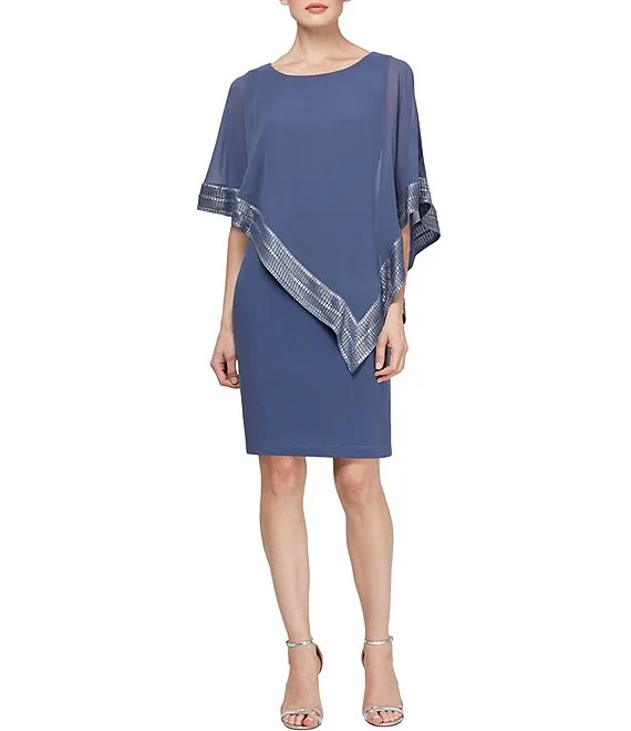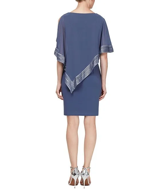 Boat Neck 3/4 Sleeve Cold Shoulder Foil Trim Asymmetrical Overlay Dress