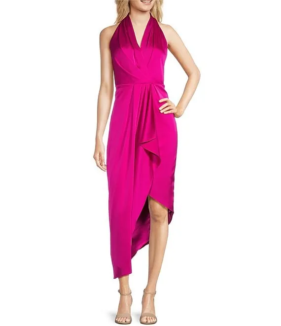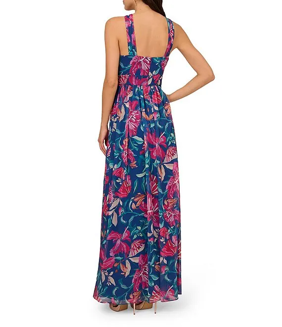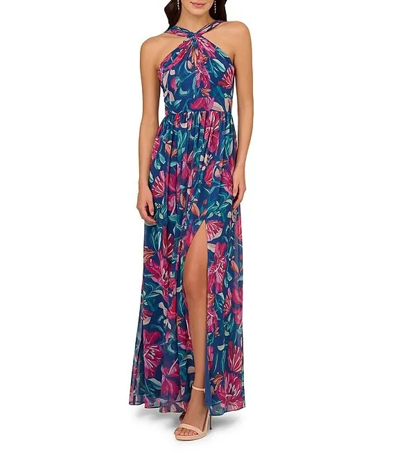 Adrianna Papell Floral Halter Neckline Sleeveless Shirred Gown