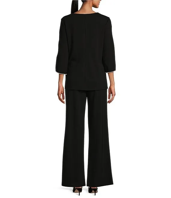 3/4 Sleeve Crew Neck Pearl Detail Scuba Crepe 2-Piece Pant Set