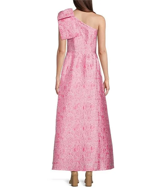 Abbey Glass Caroline Asymmetrical Neck Sleeveless Bow One Shoulder Bow Jacquard Pocketed A-Line Gown