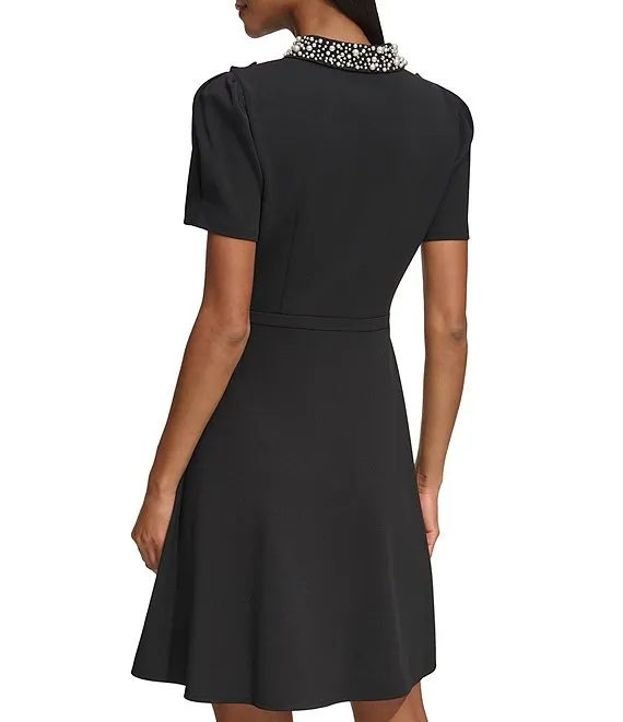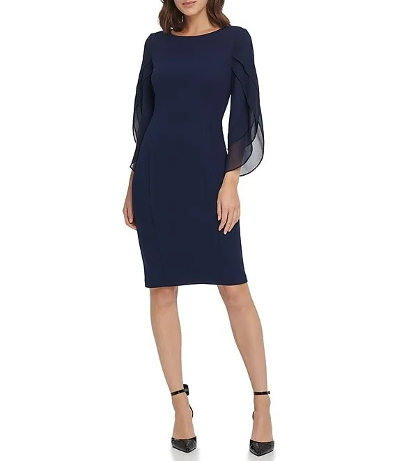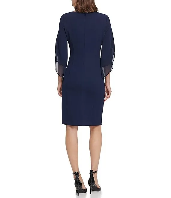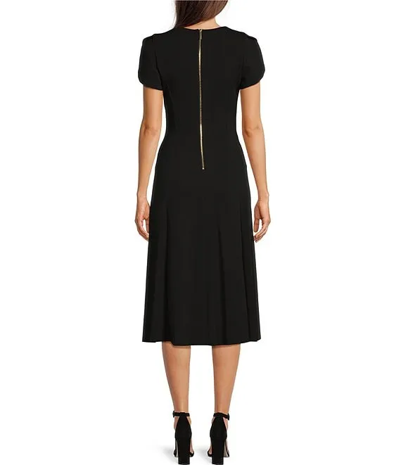Calvin Klein Scuba Crepe Short Tulip Sleeve V-Neck A-Line Midi Dress
