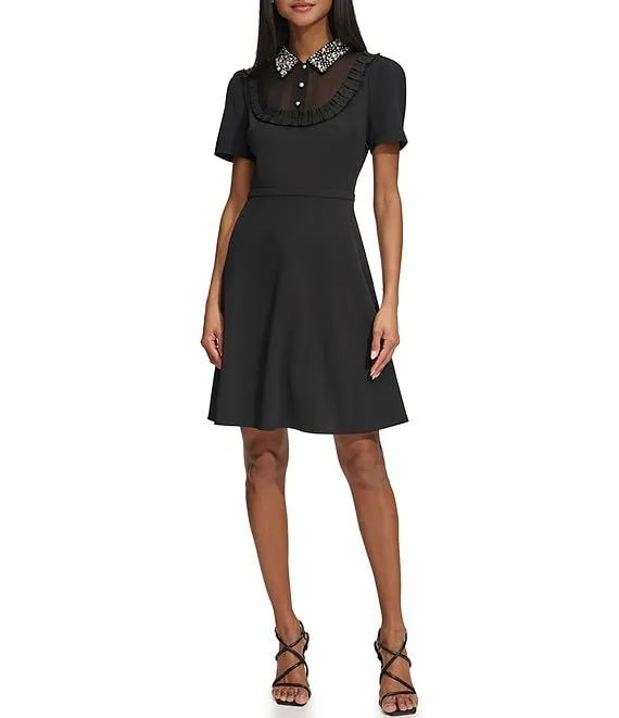 Short Sleeve Illusion Sweetheart Neck Cascading Ruffle Dress