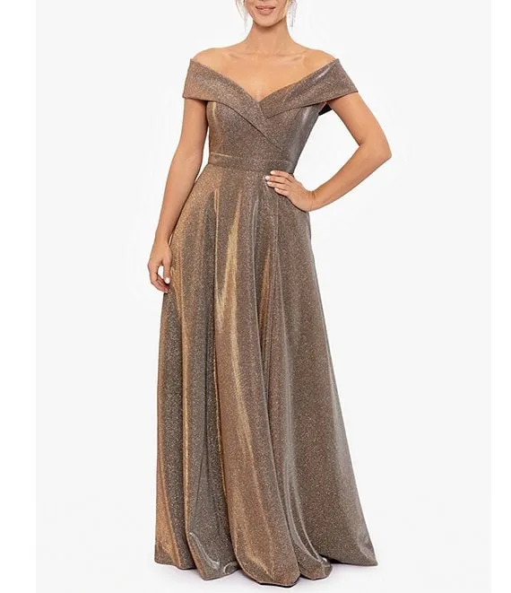 Glitter Off-The-Shoulder Cap Sleeve Pocketed Gown