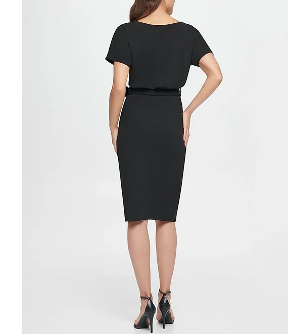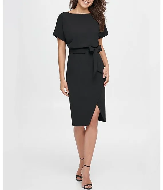Stretch Crepe V-Neck Short Sleeve Waist Bow Tie Dress