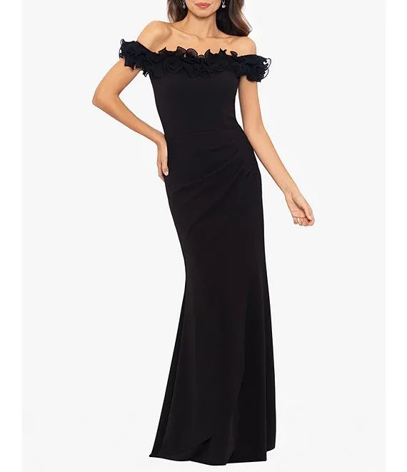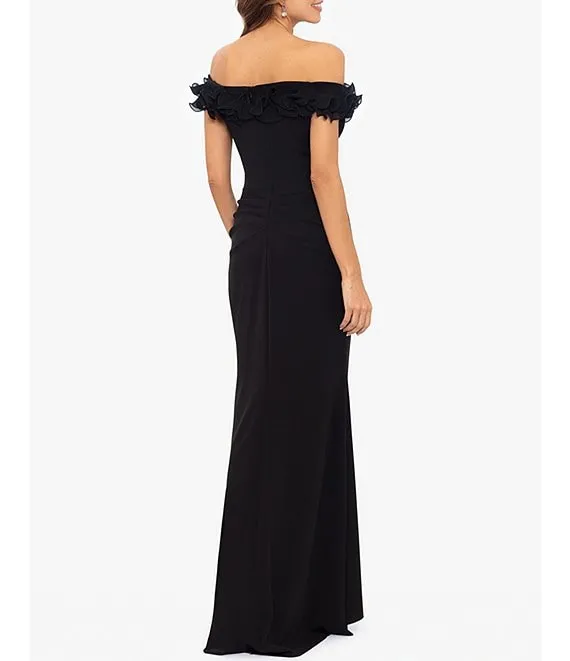 Stretch Crepe Wire Ruffle Off-the-Shoulder Cap Sleeve Mermaid Gown