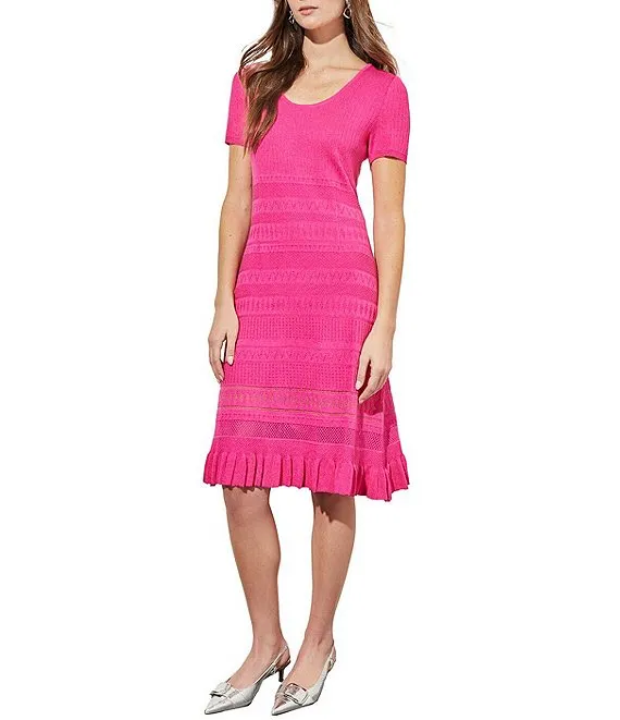 Burnout Stripe Jacquard Pointelle Knit Scoop Neck Short Sleeve Ruffle Hem A-Line Dress