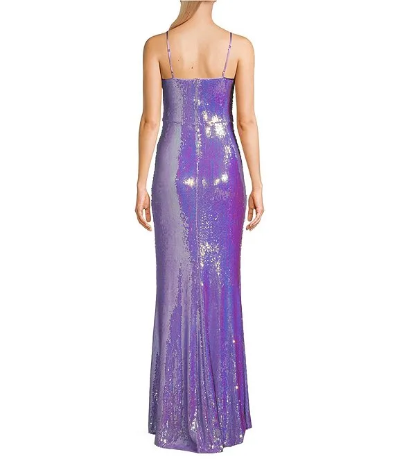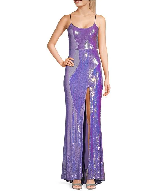 Iridescent Sequin Scoop Neck Side Slit Long Dress