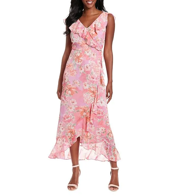 Floral Print V-Neck Sleeveless Ruffled Faux Wrap Midi Dress