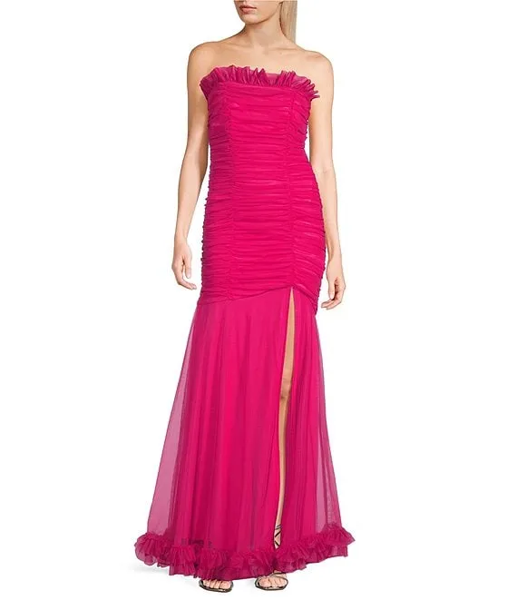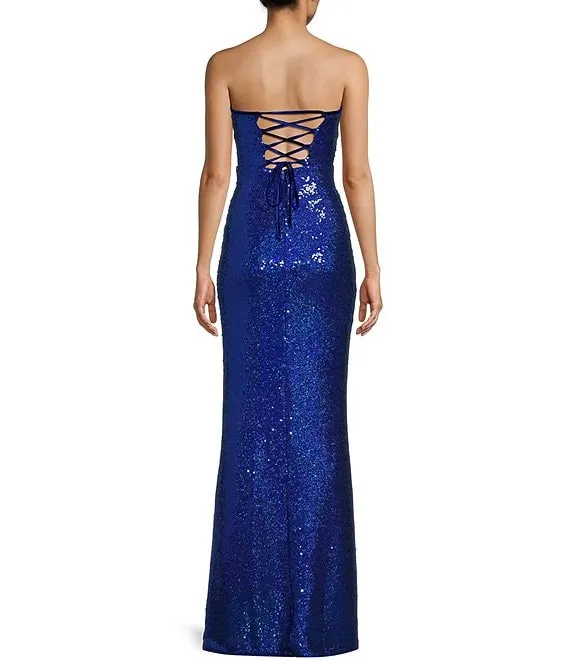 Strapless Sequin Front Slit Lace-Up Back Long Dress