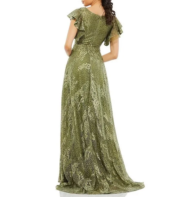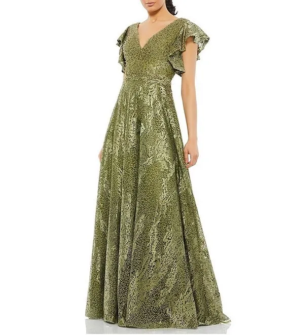 Mac Duggal Floral Embellished V-Neck Short Ruffle Sleeve Ball Gown