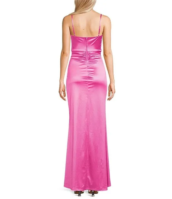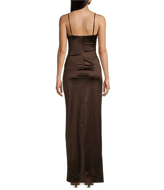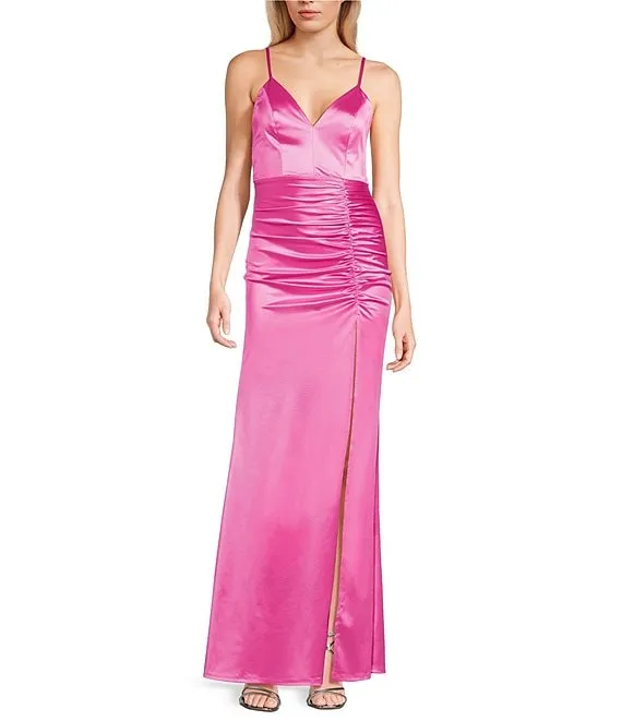 Spaghetti-Strap V-Neck Ruched Slit Silky Long Dress