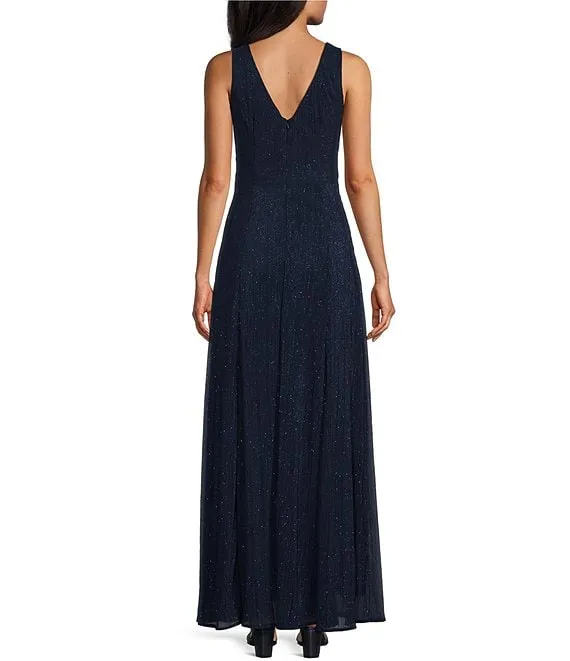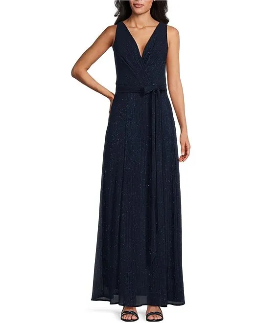 Glitter Mesh Sleeveless Surplice V-Neck Self Tie Belt Gown