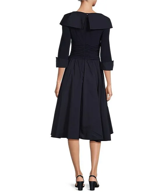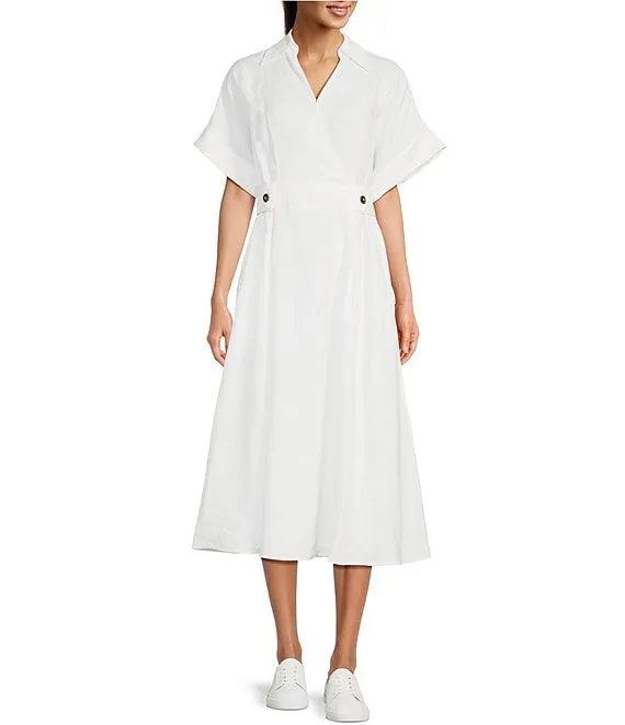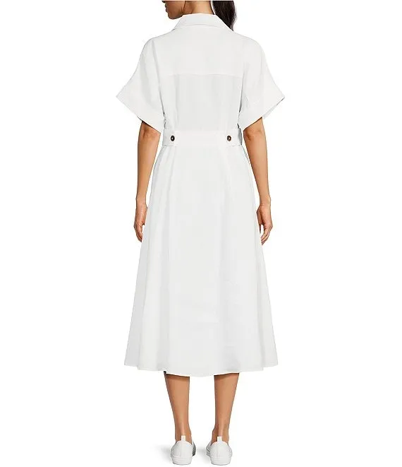 Linen Point Collar Short Sleeve Midi Fit and Flare Dress