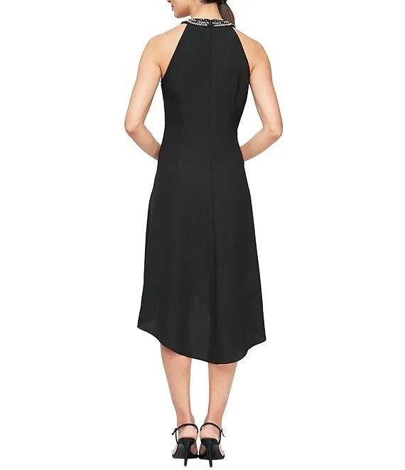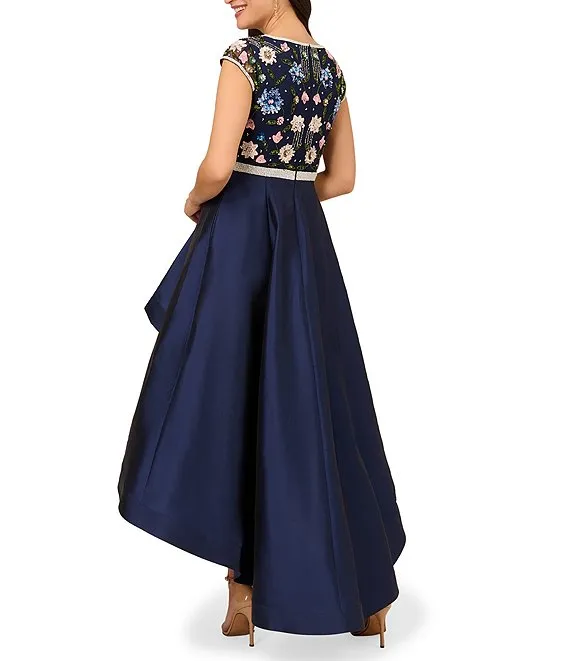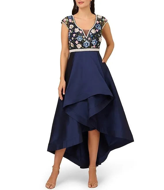 Adrianna Papell Beaded Mesh Scoop Neckline Cap Sleeve Taffeta Hi Lo Hem Gown